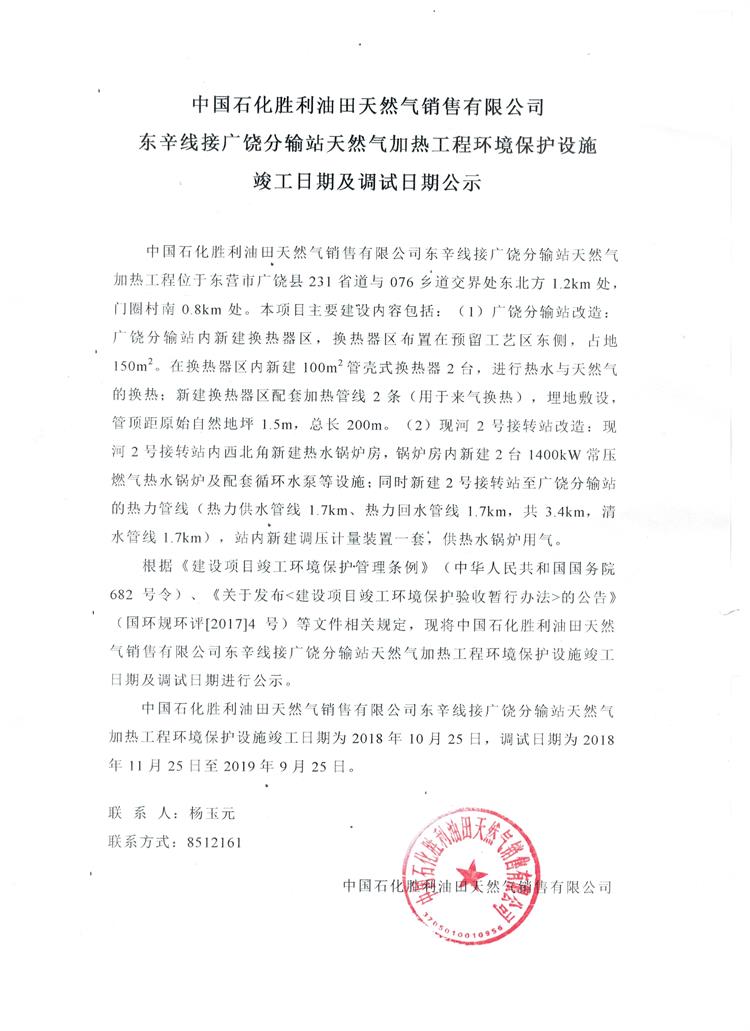 中國(guó)石化勝利油田天然氣銷(xiāo)售有限公司東辛線接廣饒分輸站天然氣加熱工程環(huán)境保護(hù)設(shè)施竣工日期及調(diào)試日期公示