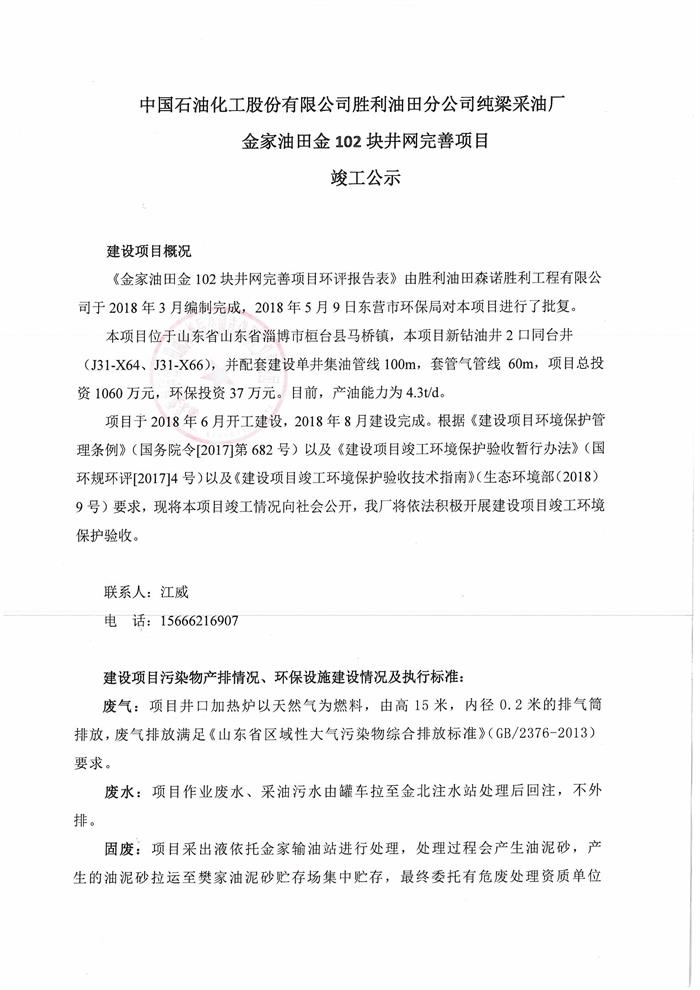 中國石油化工股份有限公司勝利油田分公司純梁采油廠金家油田金102塊井網(wǎng)完善項(xiàng)目竣工公示