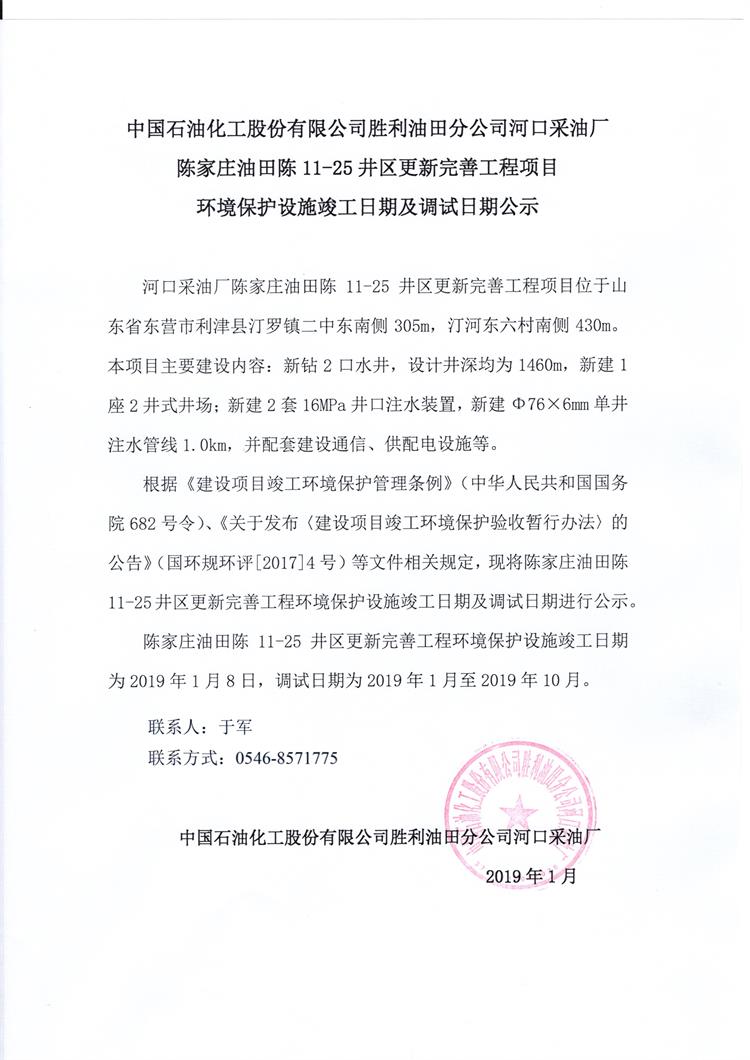 中國石油化工股份有限公司勝利油田分公司河口采油廠陳家莊油田陳11-25井區(qū)更新完善工程項(xiàng)目 環(huán)境保護(hù)設(shè)施竣工日期及調(diào)試日期公示